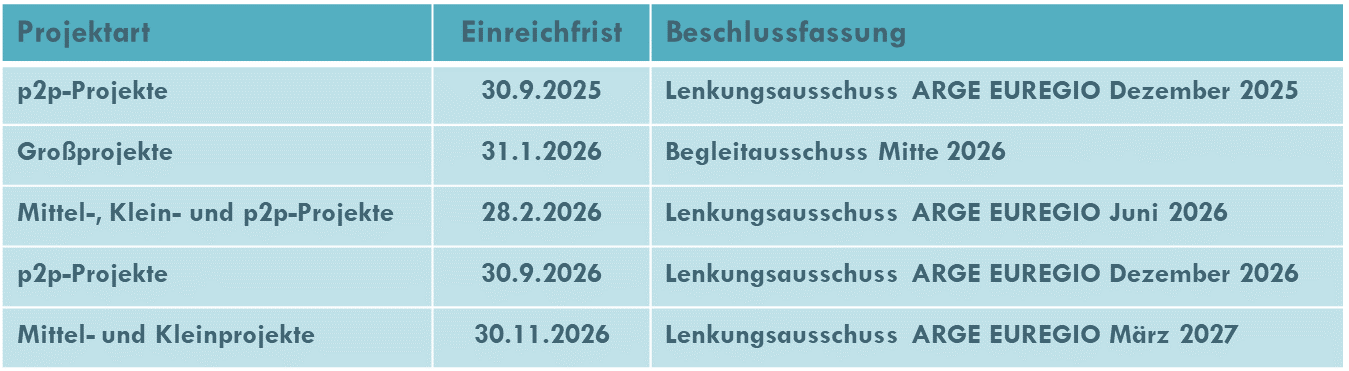 INTERREG-Projekte aller vier Projektarten können jederzeit eingereicht werden. Die Einreichfristen beziehen sich auf die Beschlussfassung im Begleitausschuss für Großprojekte bzw. im Lenkungsausschuss der ARGE EUREGIO für Klein-, Mittel- und People-to-People-Projekte. Alle bis zur Einreichfrist vollständig eingereichten Förderanträge werden in der darauffolgenden Ausschuss-Sitzung behandelt und ggf. genehmigt.