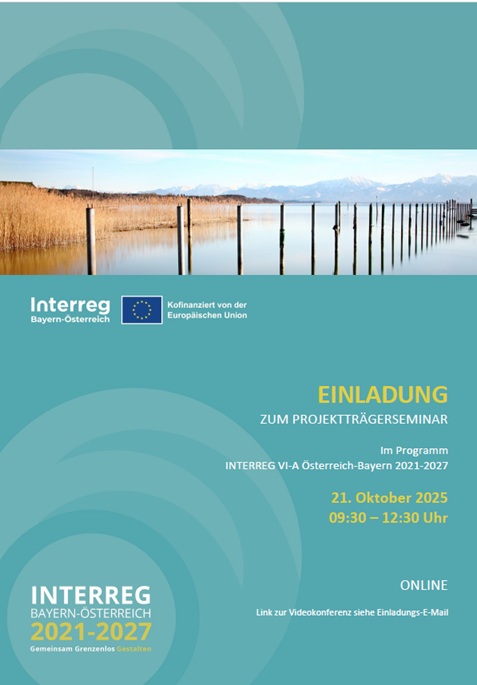 Am Dienstag, 21. Oktober 2025, von 09:30 bis 12:30 Uhr, findet ein Projektträgerseminar zur Projektumsetzung (GP, MP) im INTERREG Bayern-Österreich 2021-2027 online via Webex statt.