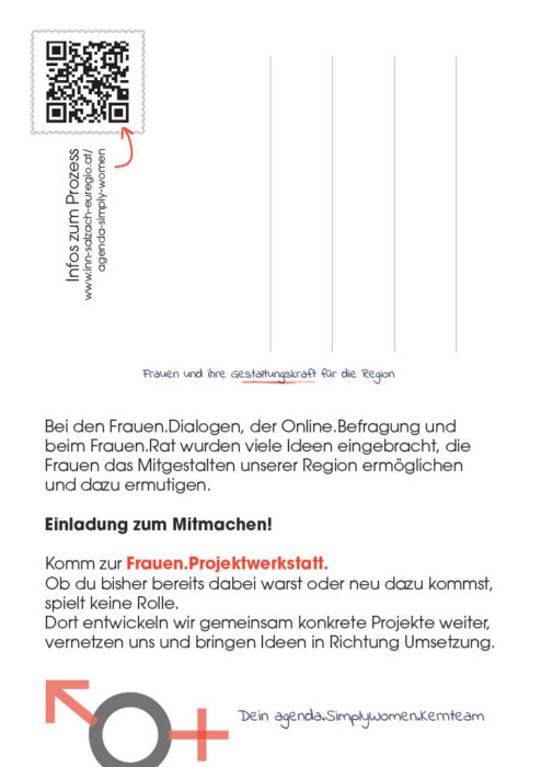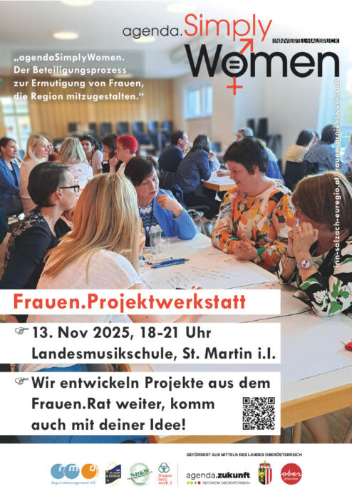 Am Donnerstag, 13. November 2025, findet von 18 bis 21 Uhr in der Landesmusikschule St. Martin im Innkreis eine Projektwerkstatt statt. Hier werden die Ideen aus dem Frauen.Rat weiterentwickelt. „Die Projektwerkstatt ist offen für alle Frauen und Männer, die Lust haben, an einer gleichberechtigten, lebenswerten und zukunftsorientierten Region mitzuwirken – egal ob frau/man schon bei den Frauen.Dialogen, der Online-Befragung oder jetzt beim Frauen.Rat dabei war oder neu dazukommt!“, lädt das Kernteam von agenda.SIMPLY WOMEN, herzlich ein.